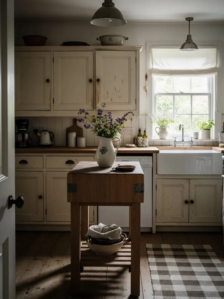 This cozy kitchen leans into the sweetest kind of nostalgia with its softly distressed cream wood cabinets and warm butcher block counters. The gentle wear on the cabinet fronts gives the whole room a lived in character that feels effortless and inviting. Natural light spills in through the window above the farmhouse sink, catching the little touches of wood and pottery throughout. The compact wooden island brings in even more texture with its chunky legs and slatted shelf, making the space feel both practical and charming in that perfectly imperfect farmhouse way.