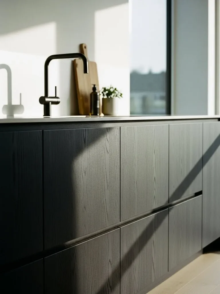 This kitchen design brings together rich charcoal wood cabinets with a beautifully subtle grain that feels warm and modern at the same time. The flat panel style keeps everything super clean and streamlined, while the matte black faucet and hardware add a chic touch that feels tailored without trying too hard. Natural sunlight washes across the cabinetry and instantly highlights the texture of the wood, giving the whole space that calm, lived-in glow we all dream of. A simple cutting board and a little potted plant finish the scene in the most effortless way, like the kitchen belongs to someone who has impeccable taste but zero interest in clutter.