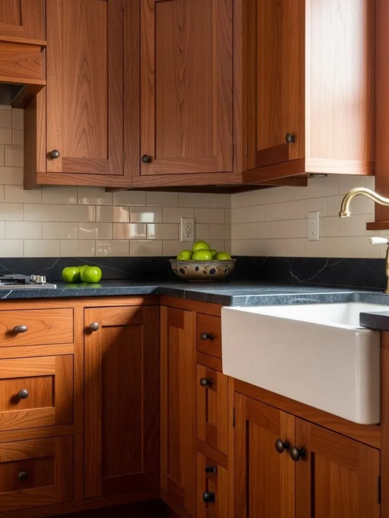 This kitchen showcases beautifully grained walnut cabinets that instantly make the space feel grounded and inviting. The warm wood tone pairs effortlessly with the glossy cream subway tile backsplash, creating a soft balance between rustic texture and polished simplicity. A crisp white farmhouse sink adds that timeless charm we all love, while the dark stone countertops give a touch of contrast that keeps everything looking elegant. The subtle bronze hardware ties the whole look together in a way that feels thoughtful and perfectly coordinated.