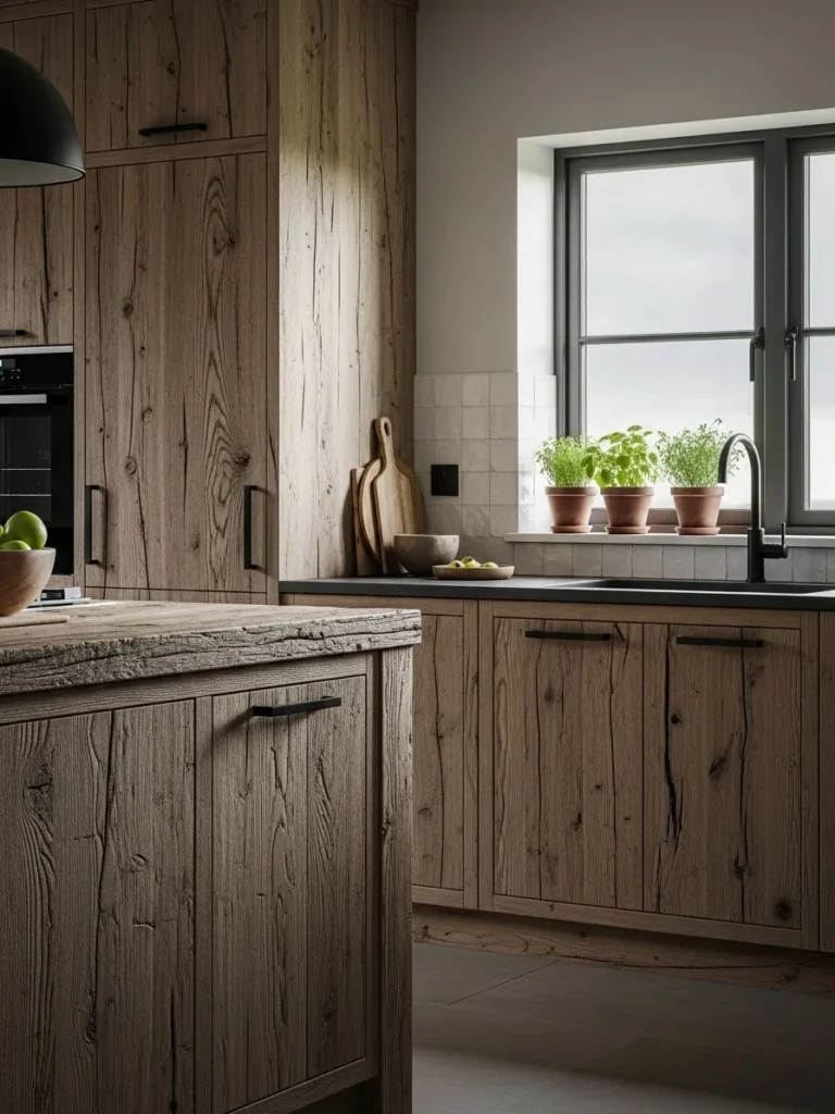 This kitchen leans into a beautifully rugged look with wood cabinets that feel straight from a cozy mountain lodge. The grain is pronounced and full of character, with natural knots and weathering that make every door panel look one of a kind. The matte black hardware keeps things feeling modern while the soft tile backsplash and stone style island add an earthy balance. I also love how the window invites in a gentle wash of daylight that highlights all those textured details, especially the herbs lined up in simple terracotta pots.