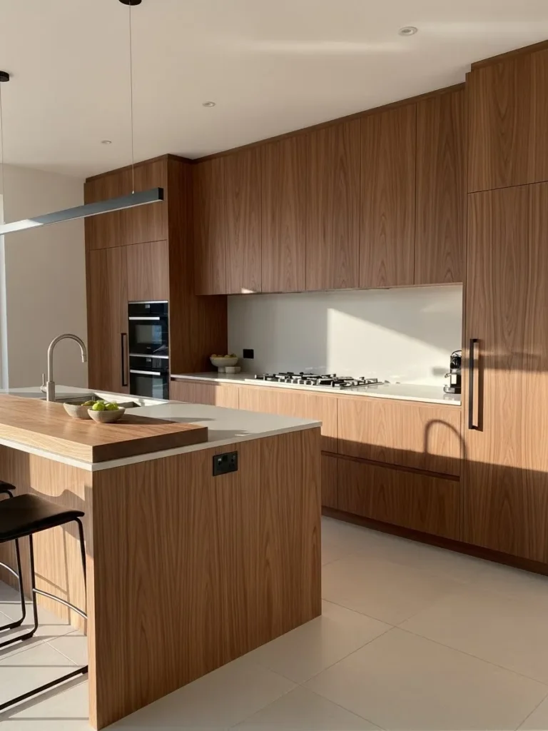 This kitchen pairs smooth wood cabinetry with a clean minimalist layout that feels so calm and inviting. The full wall of flat panel cabinets brings in gorgeous natural texture while keeping everything sleek and uninterrupted. I love how the warm wood tone softens the modern lines and creates this effortless balance between cozy and contemporary. The bright white countertops and slim window add a fresh airy touch that makes the whole space feel open without needing a ton of decor. Even the appliances blend in beautifully which keeps the look refined and fuss free.