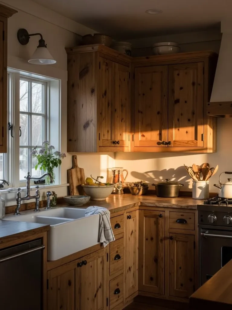 This kitchen brings all the charm of knotty pine cabinets to life with its warm honey tones and beautifully textured wood grain. The natural knots add character in the sweetest way, giving the entire space that collected over time feeling so many of us love. Soft afternoon sunlight washes over the countertops and highlights the rustic details, while the farmhouse sink, vintage style faucet, and simple black hardware keep everything feeling grounded and practical. The mix of functional pieces like cutting boards, pottery, and a cast iron pot creates a lived in look that still feels intentional and stylish.