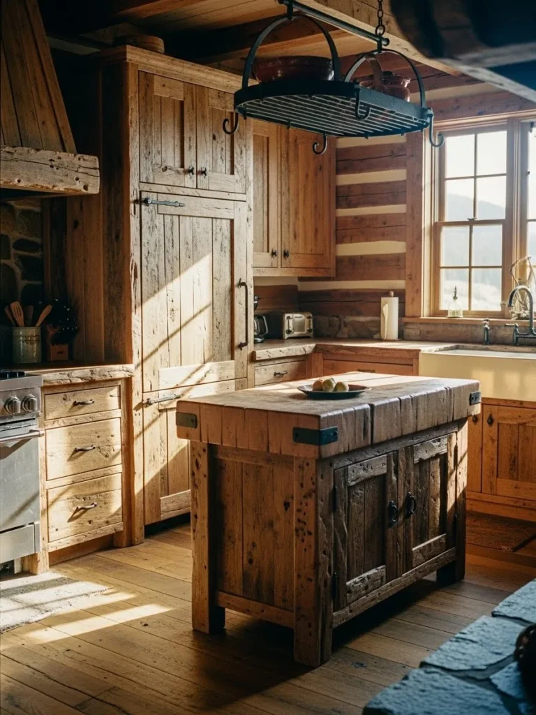 This kitchen brings out the warm charm of reclaimed wood in the most inviting way. The cabinets, island and even the range hood are all crafted from richly textured timber that feels full of character. Sunlight pours through the window and catches every knot and grain, which makes the entire space glow in that soft golden way only natural wood can pull off. The chunky butcher block island adds a grounded centerpiece and the iron pot rack overhead adds just the right touch of rugged character. Everything about this room feels sturdy and beautifully worn in.