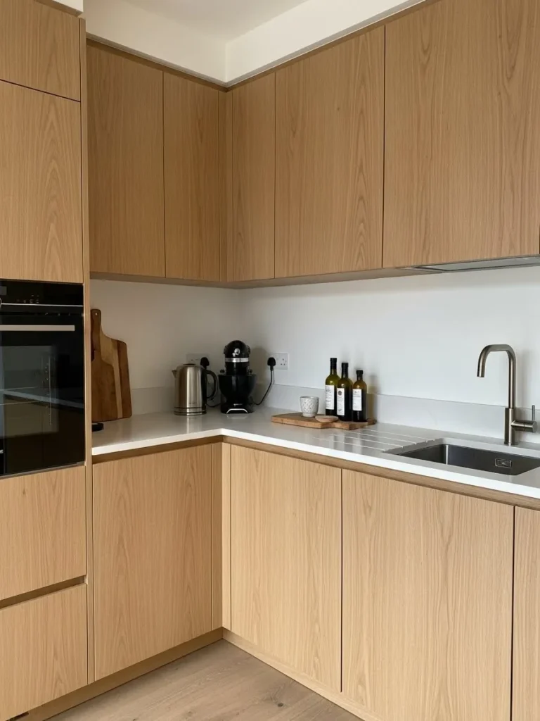 This kitchen keeps things beautifully simple with its light oak cabinets that wrap around the space in the most seamless way. The natural wood grain brings gentle texture without feeling heavy and the flat panel design gives everything a clean modern look. The soft white countertops brighten the room and pair so nicely with the warm timber tones. I love how the upper and lower cabinets create a smooth visual flow while the stainless faucet and small appliances add just enough contrast to keep the space feeling fresh. It is one of those layouts that feels effortless yet stylish at the same time.