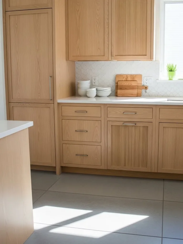 This kitchen shows how calming light wood can be when everything is kept simple and thoughtful. The cabinets have a soft natural grain that feels warm without ever competing for attention. I love how the vertical detailing on a few of the doors adds just a touch of texture that makes the space feel more custom. The pale backsplash keeps everything airy while the white countertop pulls the whole space together. It feels clean and modern yet still so welcoming, especially with the sunlight pooling across the floor.