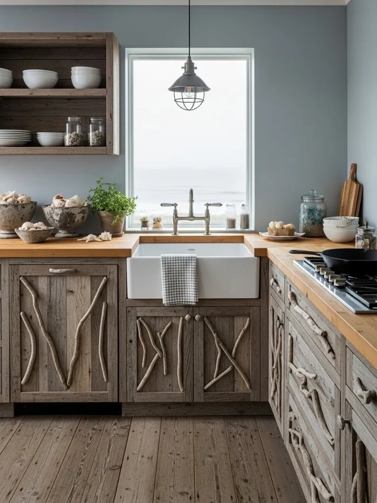 I love how this space feels both handcrafted and calming at the same time. The driftwood detail makes the cabinets look like art pieces and it gives the whole room this effortless seaside charm. I can imagine myself making morning coffee here while enjoying how peaceful and grounded the textures feel. It is such a pretty mix of rustic personality and coastal elegance and it instantly puts me in a good mood.