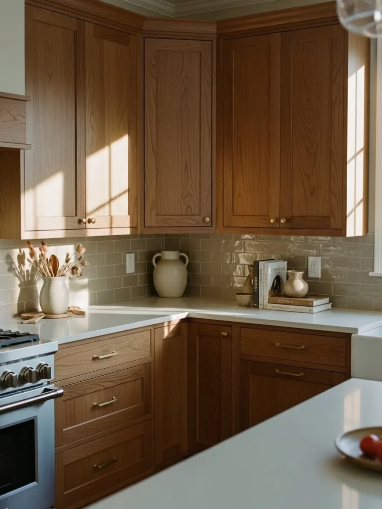 This kitchen brings together warm natural wood cabinets with a gentle, creamy backdrop that makes the whole space feel relaxed and welcoming. The grain on the cabinetry adds subtle movement while the soft beige tile backsplash keeps everything calm and earthy. I love how the simple brass hardware pulls the look together without trying too hard. The white countertops brighten the room and let the warm wood tones shine while the curated touches like ceramics, dried stems, and stacked books add a cozy bit of personality.