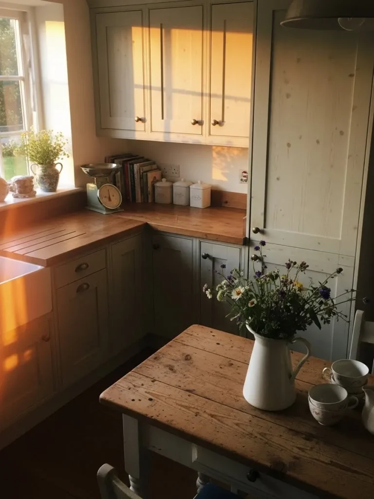 This kitchen feels like the sweetest little country nook where warm wood textures and soft light instantly make the space feel comforting. The cabinets have a lovely pale painted finish that lets the natural wood grain show through, and the butcher block countertops add that perfect earthy touch. The morning sun pours across the room and makes every detail glow. Even the small table with its well loved wooden top adds to the gentle charm, especially with the simple pitcher of wildflowers set right in the middle. Everything feels calm, warm, and so effortlessly welcoming.